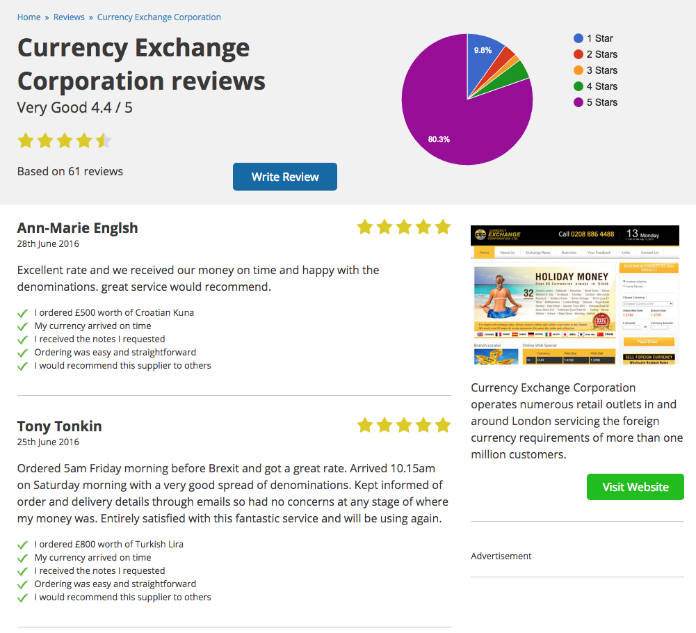 For instance, you can get $1,397.50 from Currency Exchange Corporation. They have 61 reviews and about 4.5 stars out of 5. When you click into their review section, you’ll see that the vast majority are five-star reviews from people who received a great service.