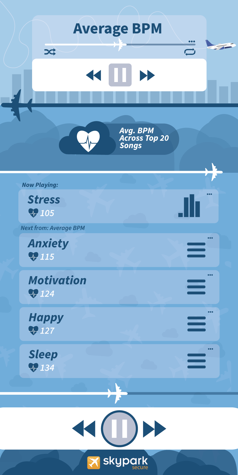 We then took the top 20 songs from each compiled playlist, looked at their BPMs to create an average.