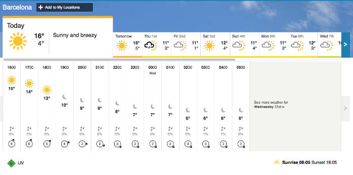 So BBC is the most popular weather site to visit a fortnight before your holiday, and then once you’re a week away you can switch over to the Met Office.
